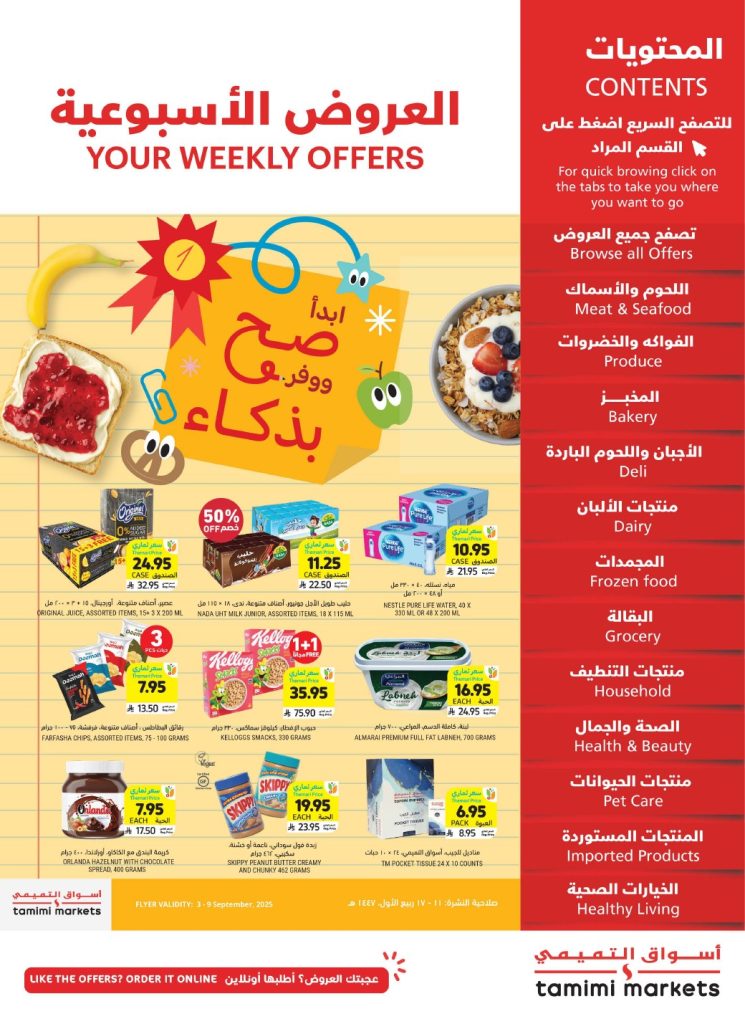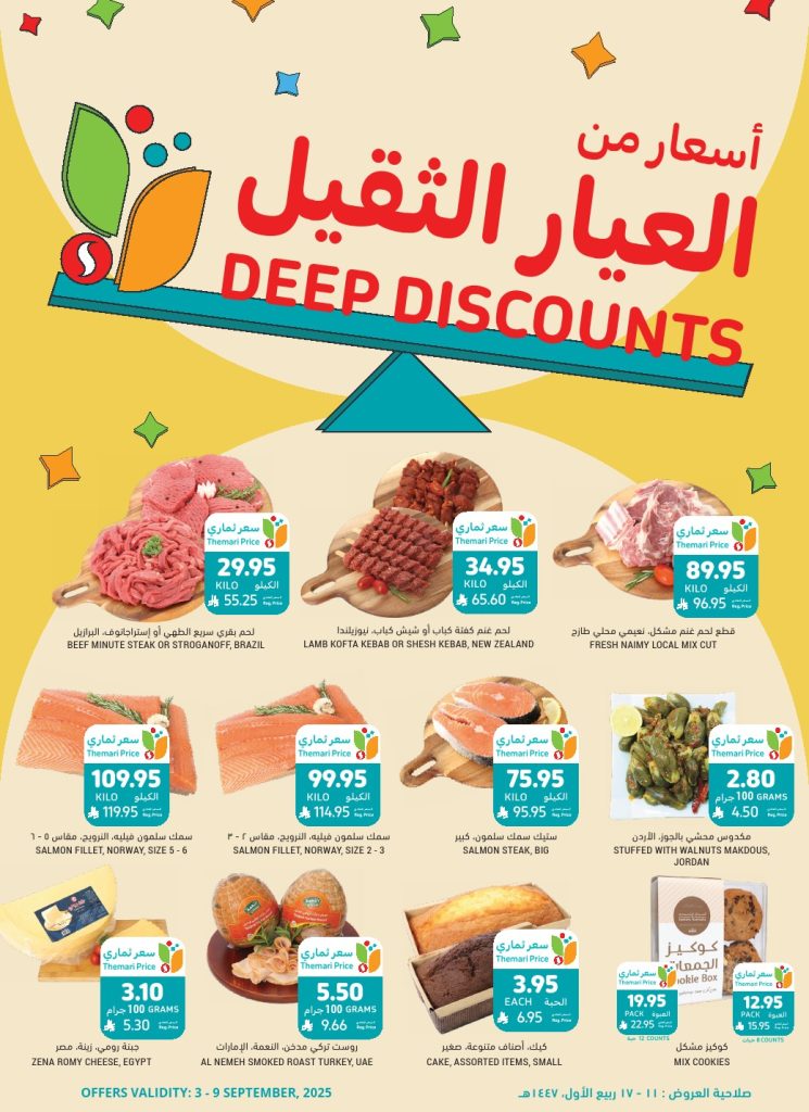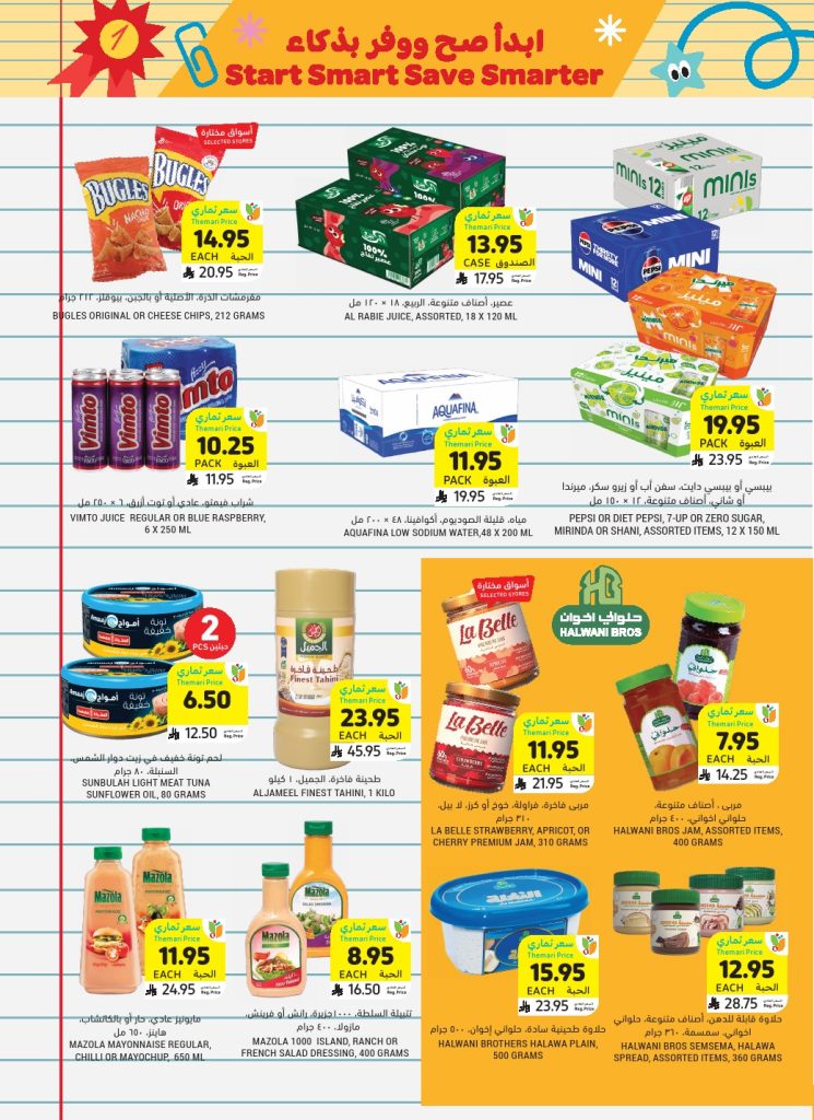 سبتمبر هو الوقت المثالي للتخطيط… جهّز حقيبة النجاح مع عروضنا الخاصة. استعد لتجديد مخزون مطبخك بأفضل الأسعار. نقدم لك مجموعة واسعة من الأطعمة الطازجة والمعلبة والمجمدة، كلها بتخفيضات حصرية لكي تستمتع بالجودة دون أن تدفع الكثير. لا تدع هذه الفرصة الذهبية تفوتك!