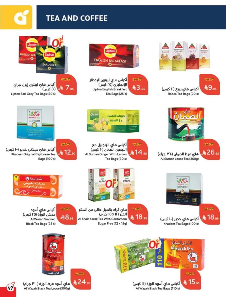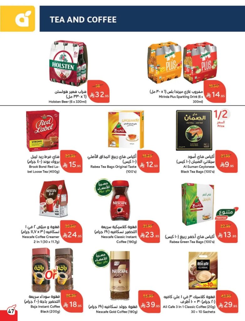 الشاي والقهوة: كذلك يوجد أيضاً أكياس شاي العلامة الحمراء من بروك بوند. كذلك  بينما يوجد شاي فرط من ليبتون. قهوة سريعة التحضير بالنكهات من ماكسويل هاوس .