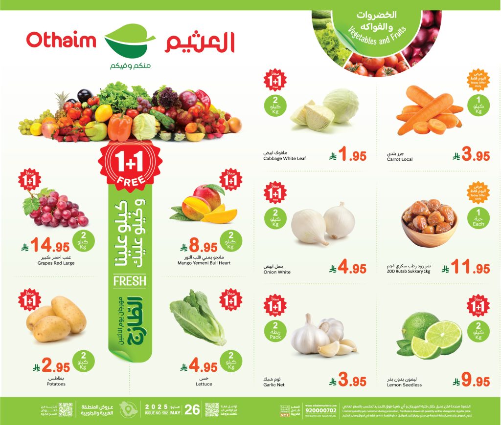 عروض العثيم الخضار الطازج الاثنين 26 مايو 2025 الموافق 28\11\1446 كيلو+كيلو مجاناً +العروض الأسبوعية