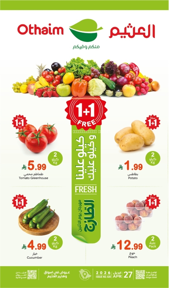 عروض العثيم مهرجان الخضار الطازج الاثنين 27 ابريل 2026 الموافق 10 ذو القعدة 1447 كيلو عليك وكيلو علينا & العروض الأسبوعية