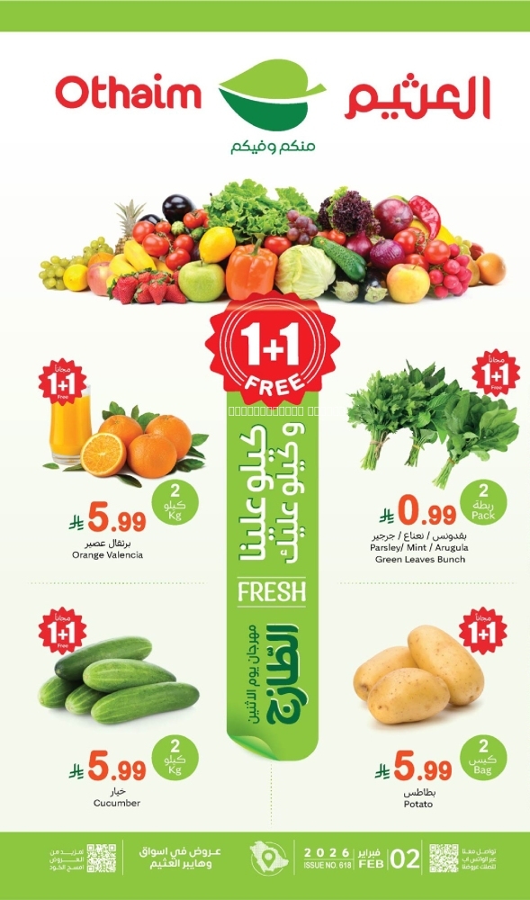 عروض العثيم مهرجان الخضار اليوم 2 فبراير 2026 الموافق 14 شعبان 16\8\1447 كيلو عليك وكيلو علينا & العروض الأسبوعية